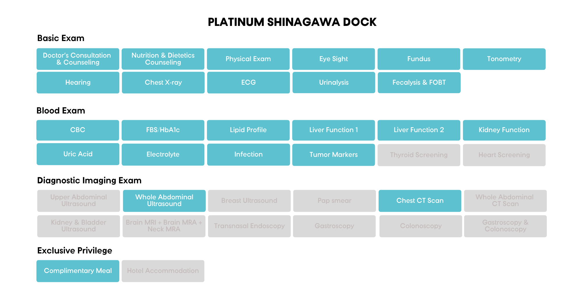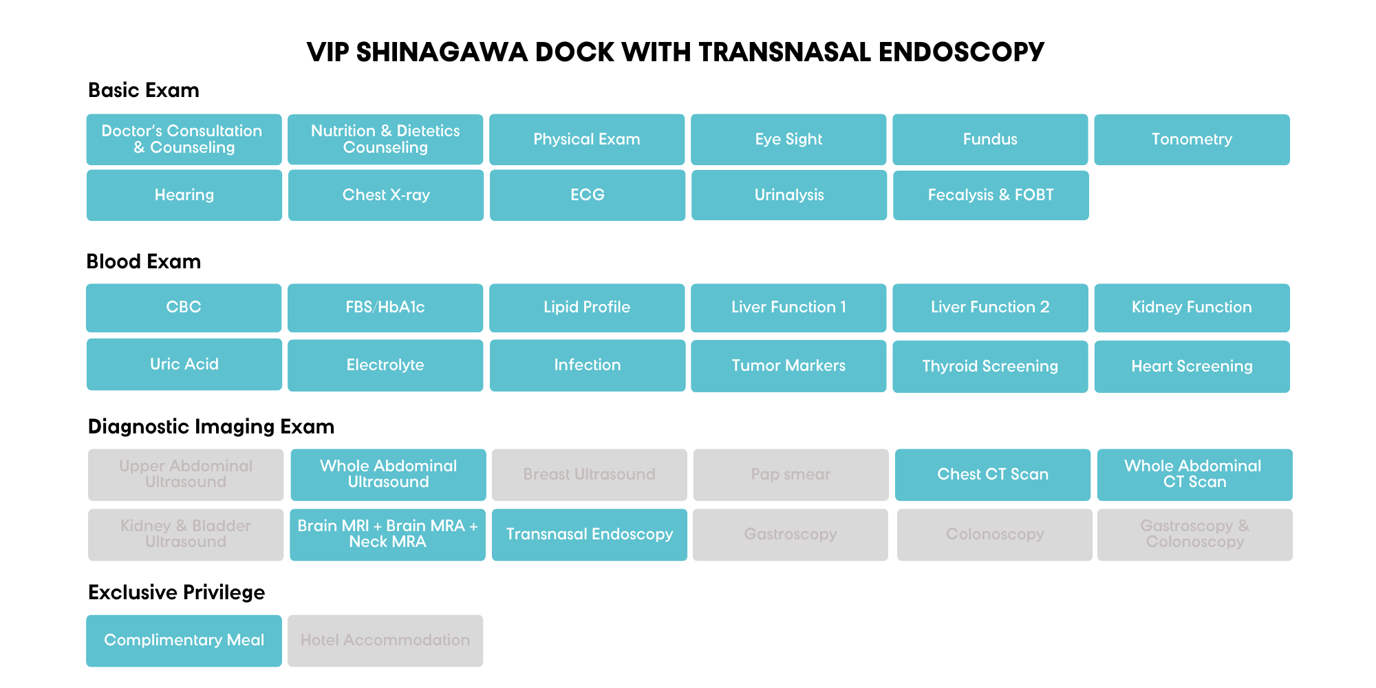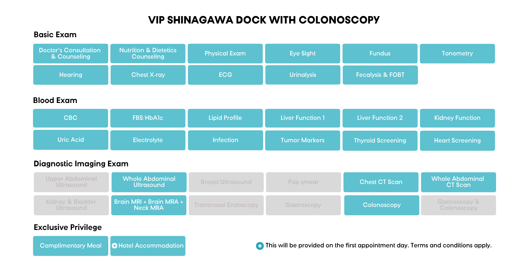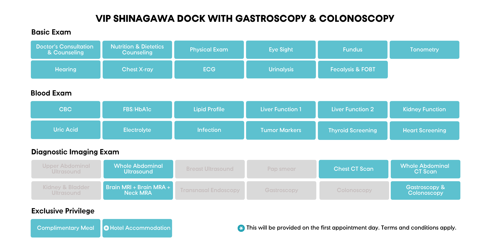 - Note: Patients who avail of the VIP Shinagawa Dock with Colonoscopy or Gastroscopy & Colonoscopy will receive a complimentary hotel accommodation voucher, which will be issued on the day of the first appointment. If the package is availed at a discounted rate, the hotel voucher will no longer be applicable. Terms and conditions apply.