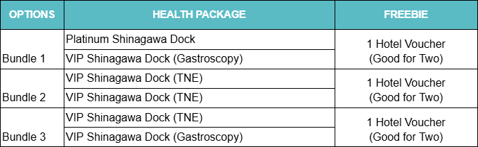 - Bundled patients are eligible to receive a free hotel voucher if they avail any of the participating health packages on the same appointment date and time.