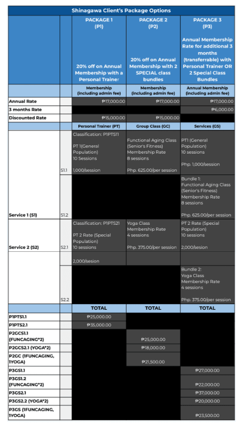 | PACKAGE 1 (P1) 20% off on Annual Membership with a Personal Trainer | PACKAGE 2 (P2) 20% off on Annual Membership with 2 SPECIAL class bundles | PACKAGE 3 (P3) Annual Membership Rate for additional 3 months (transferrable) with Personal Trainer OR 2 Special Class Bundles | ||