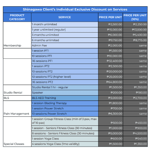 Service 2 (S2) | ST2.1 | Classification: P1PTS21 ₱2,000/session | Yoga Class ₱375.00/per session | PT 2 Rate (Special ₱2,000/session |